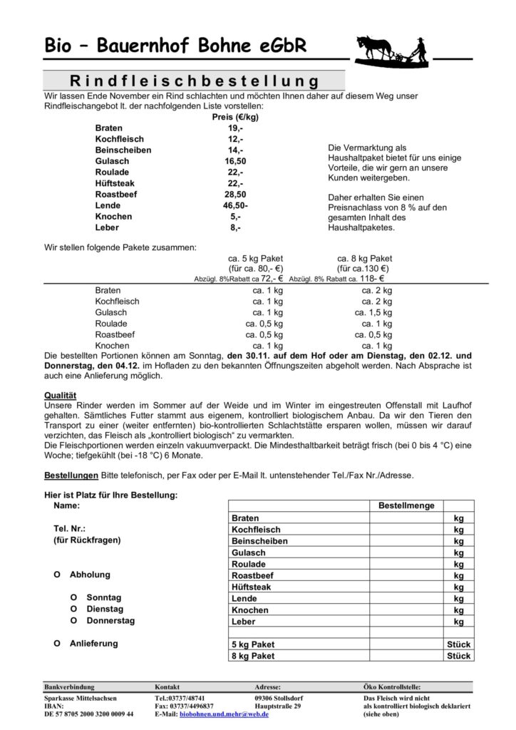 Ende November schlachten wir wieder ein Rind von unserem Biohof. Ab sofort können Sie bestes, kontrolliert biologisch erzeigtes Rindfleisch aus unserer eigenen Haltung vorbestellen.